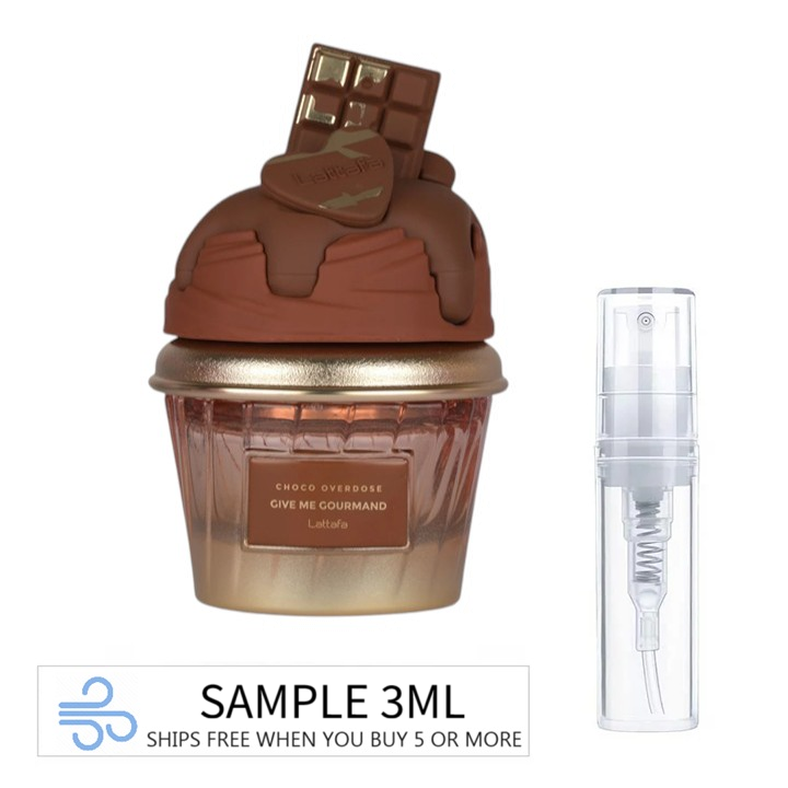 Lattafa Give Me Gourmand Choco Overdose. Because these bottles are smaller and more expensive than most Lattafas, we are offering them as 3ML decants instead of 5ML to keep them affordable.